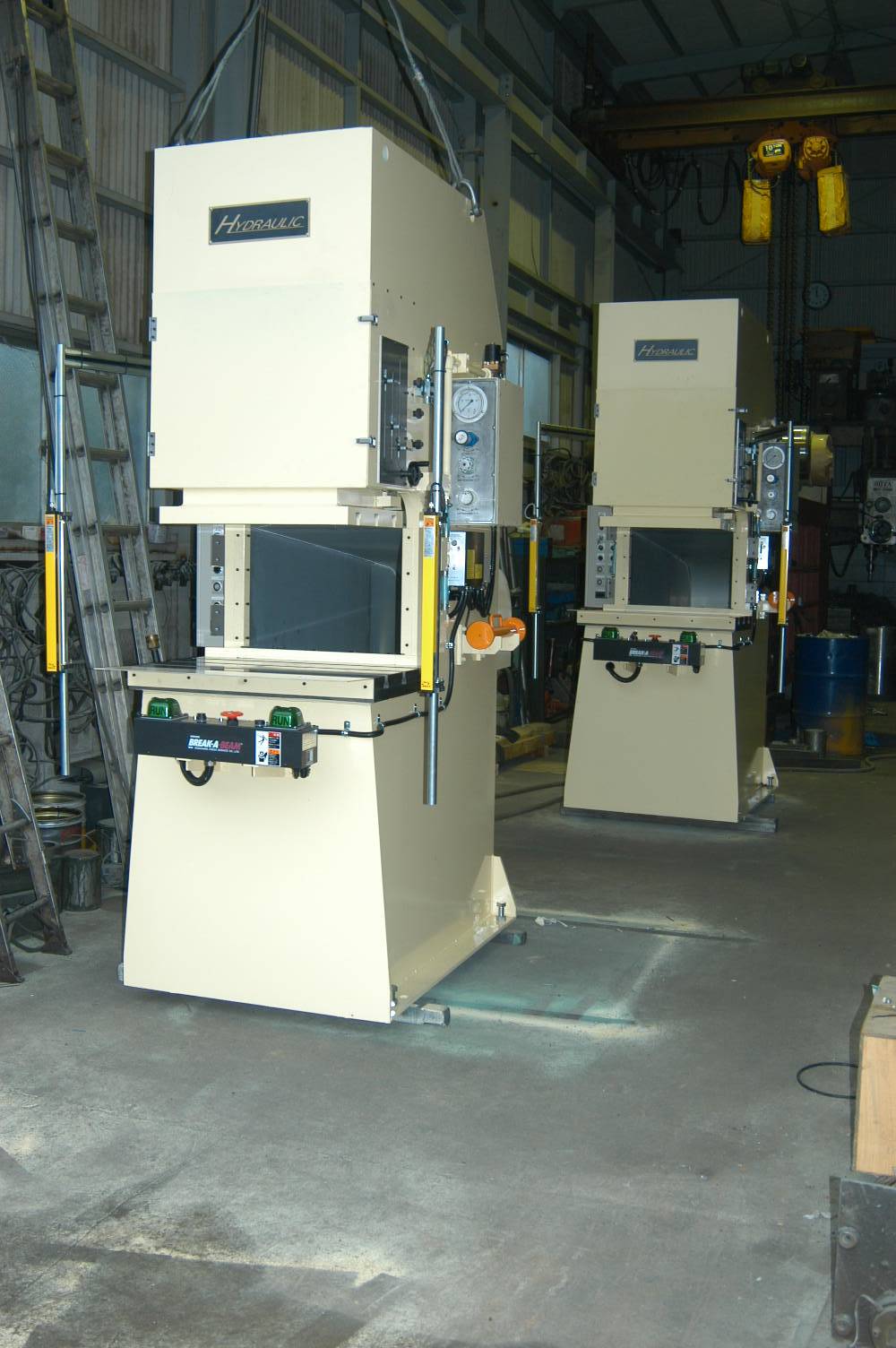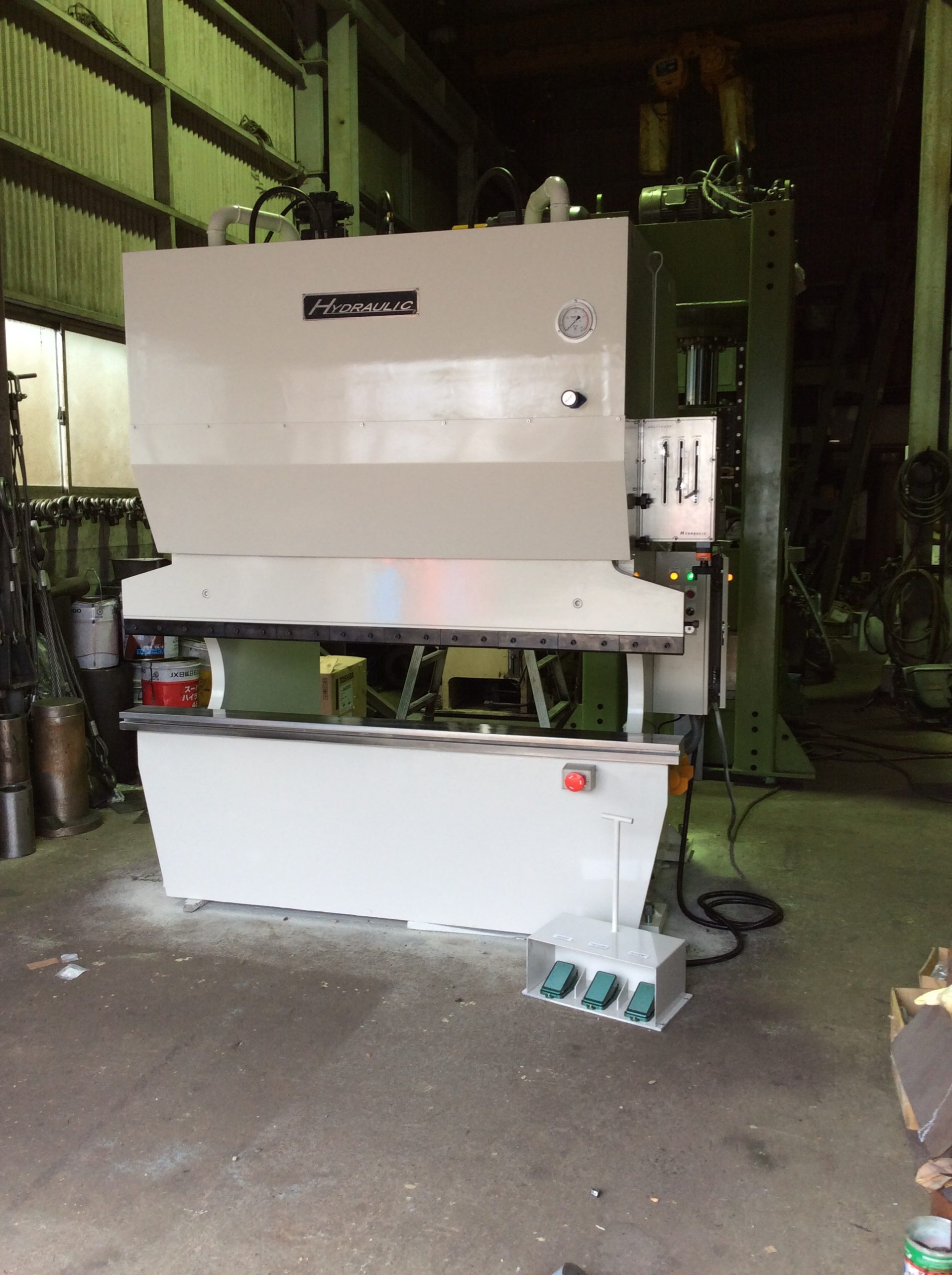 板材用油圧ブレーキプレス、テーブルは左右5,000mmと大きく板材の端曲げを主目的とした油圧プレスです。スアタッチメントの交換により、他のプレス加工も可能です。
