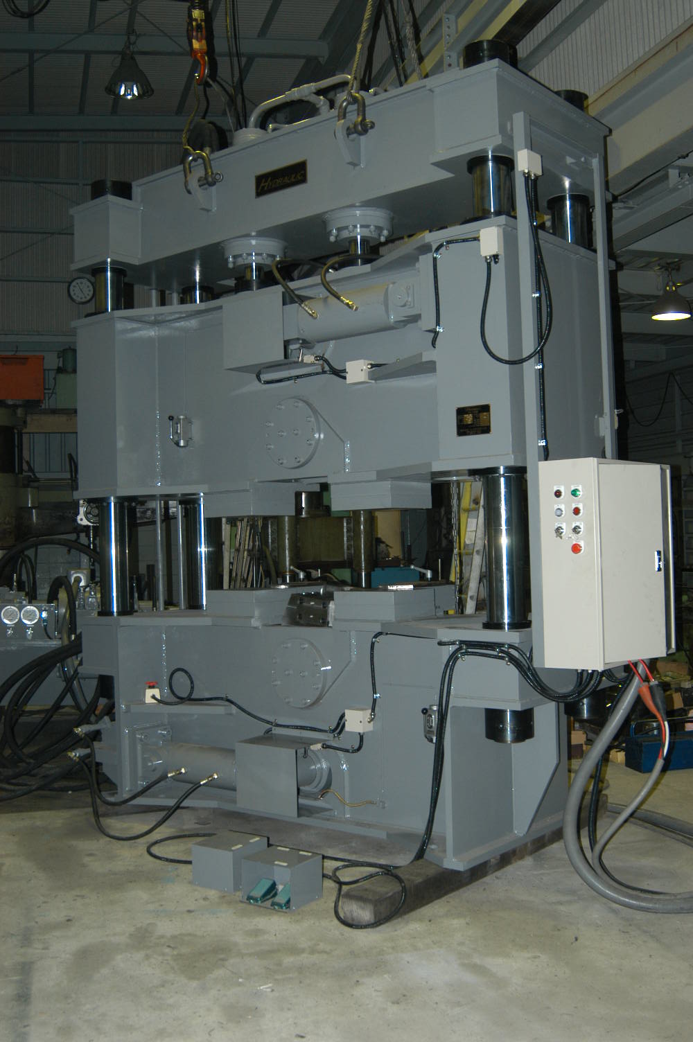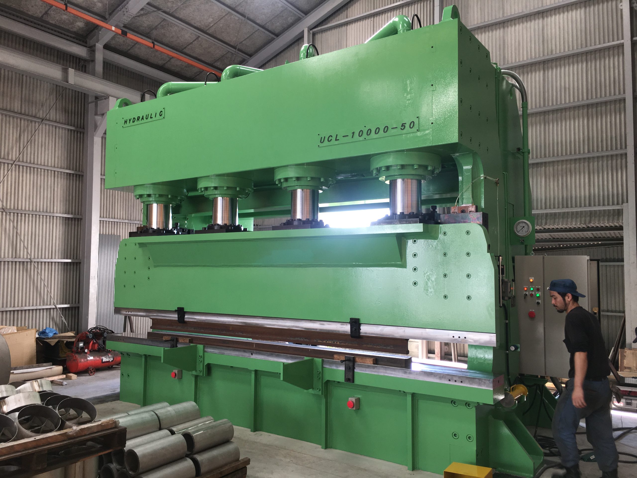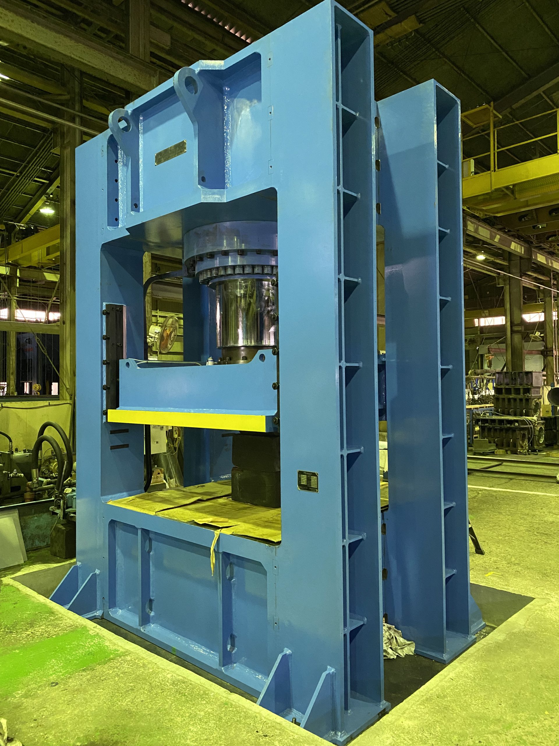 本油圧プレスはテーブル面積左右9,000mm前後3,000mmと大きく、極厚鋼板の成形に使用されています。