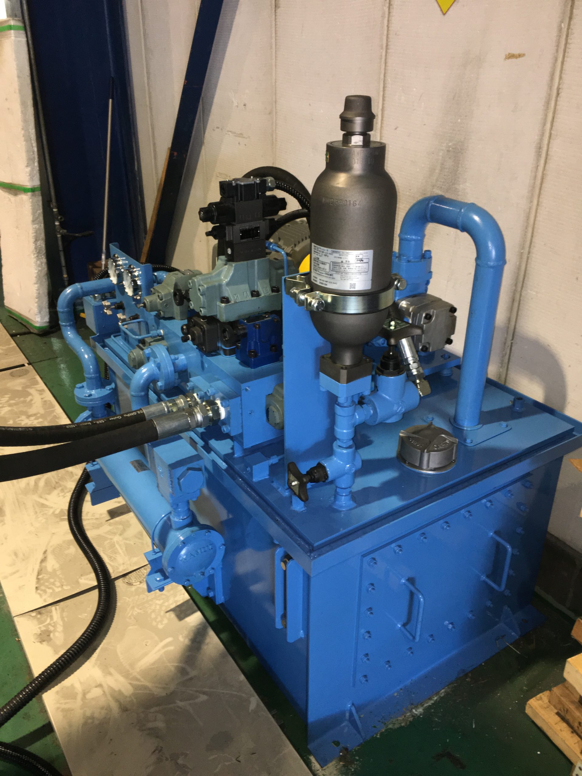 本機は鋼板の抜き及び成型加工を行う、油圧プレス用油圧ユニットです、アキュームレーター使用により、油圧プレス抜き加工などのショックの軽減に発揮しております。