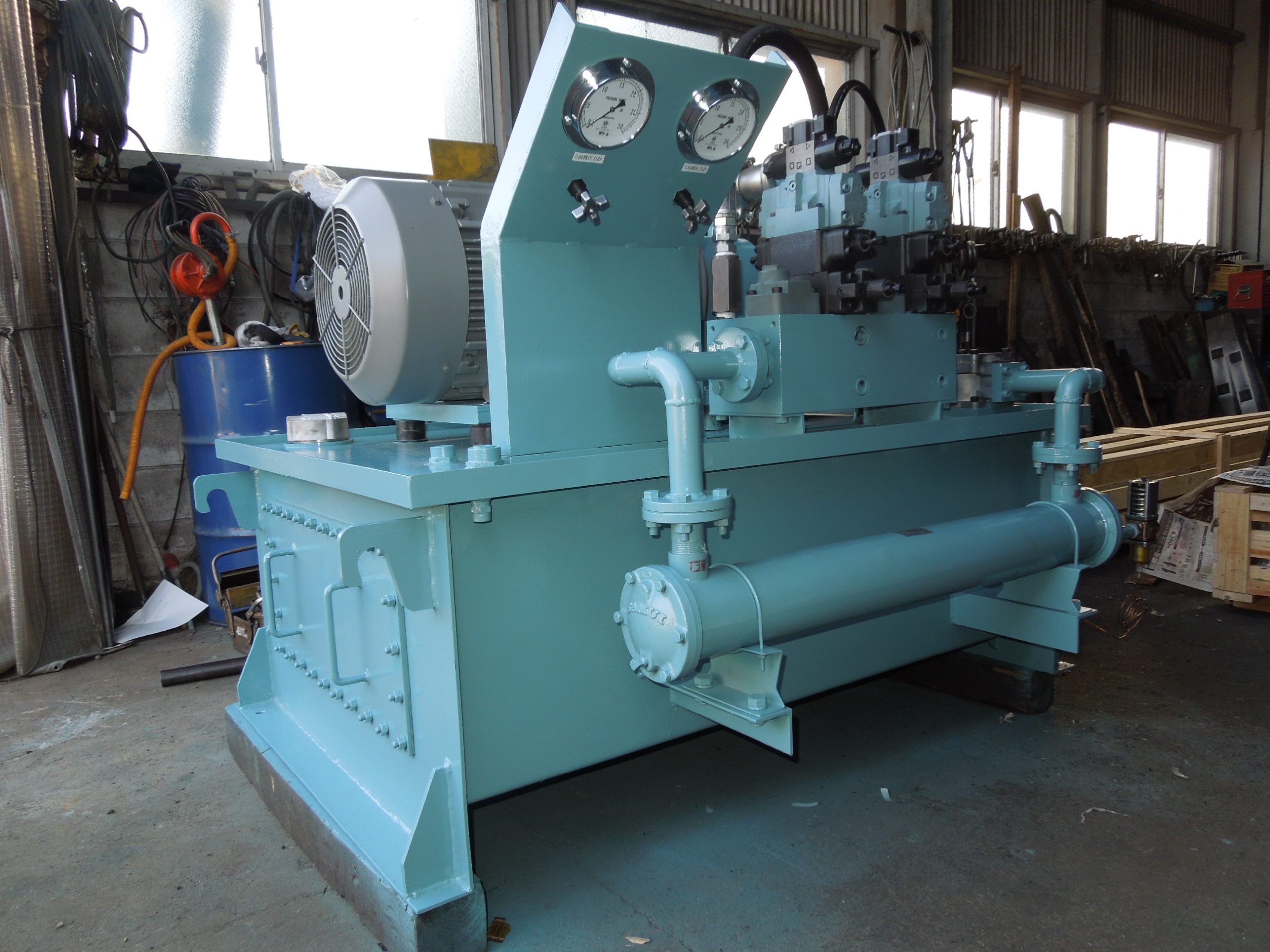 本機は鋼板の抜き及び成型加工を行う、油圧プレス用油圧ユニットです、アキュームレーター使用により、油圧プレス抜き加工などのショックの軽減に発揮しております。
